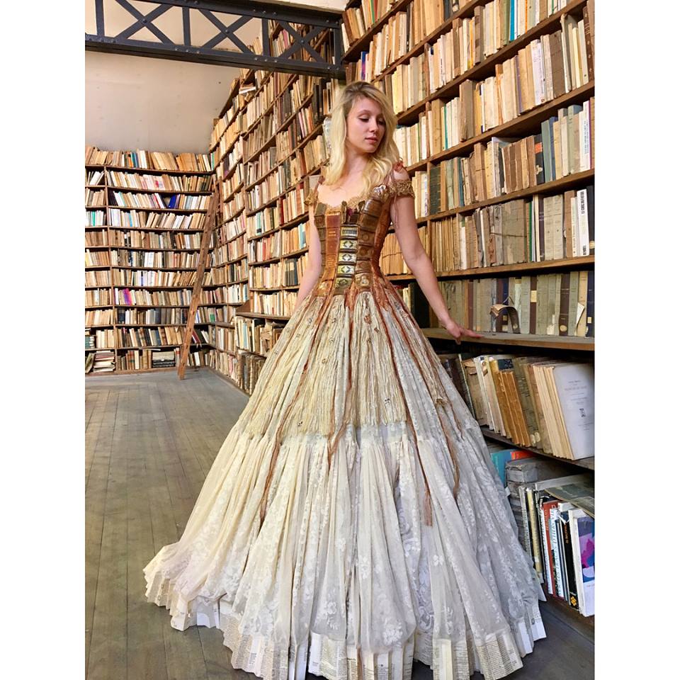 Например, една от нейните рокли е направена от книжни корици и страници на остарели книги