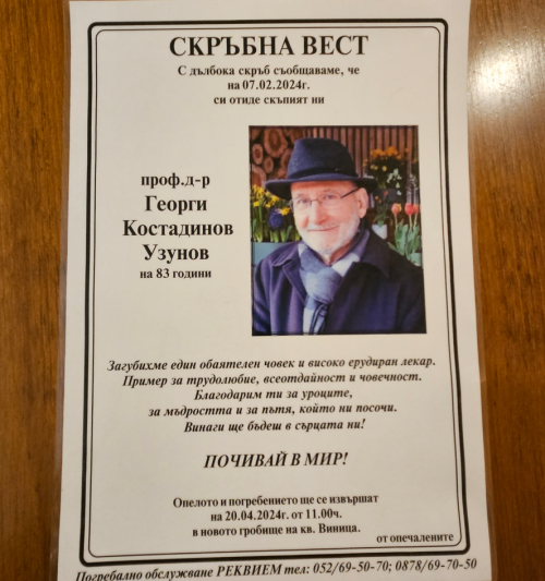 Напусна ни проф. доктор Георги Узунов, д.м.н., експерт по Образна диагностика, началник на бранша по рентгенология към Катедрата по рентгенология и радиология в МУ-Варна /1983-1991/, почитан експерт, сътрудник и учител.