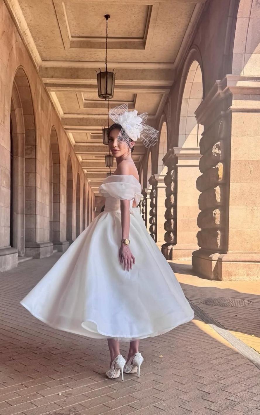 „ С леля я измислихме на път от Истанбул за България. Тя я уши за две денонощия. Два дни и две безсънни нощи. Не я бях мерила, тъй като аз трябваше да съм си в София. Велизар я докара три часа преди сватбата. И тя застана като излята върху мен “, споделя историята на сватбената си рокля красивата младоженка. На празненството пък тя бе избрала по-семпла рокля от сатен.