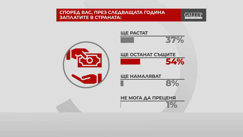 Според по-голямата част от хората - 54% - заплатите в страната през идната година няма да се трансформират. 37% считат, че възнагражденията ще се усилят, а 8% - че ще намалеят.