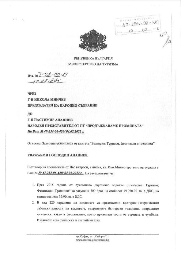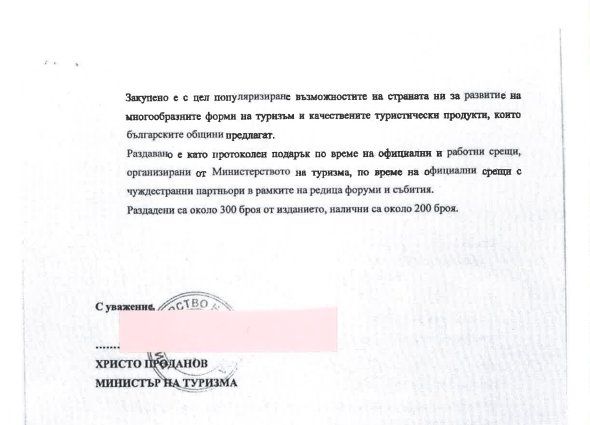 В книгата в действителност има послание на тогавашния министър на туризма Ангелкова и нейна фотография. Подобно издание е част от протокола, такава е практиката във всички страни, обясниха от сектора. И отново като част от протокола постоянно има послание на настоящия министър и негова фотография. Подобна книга е била издадена и при идващия министър на туризма Мариана Николова.