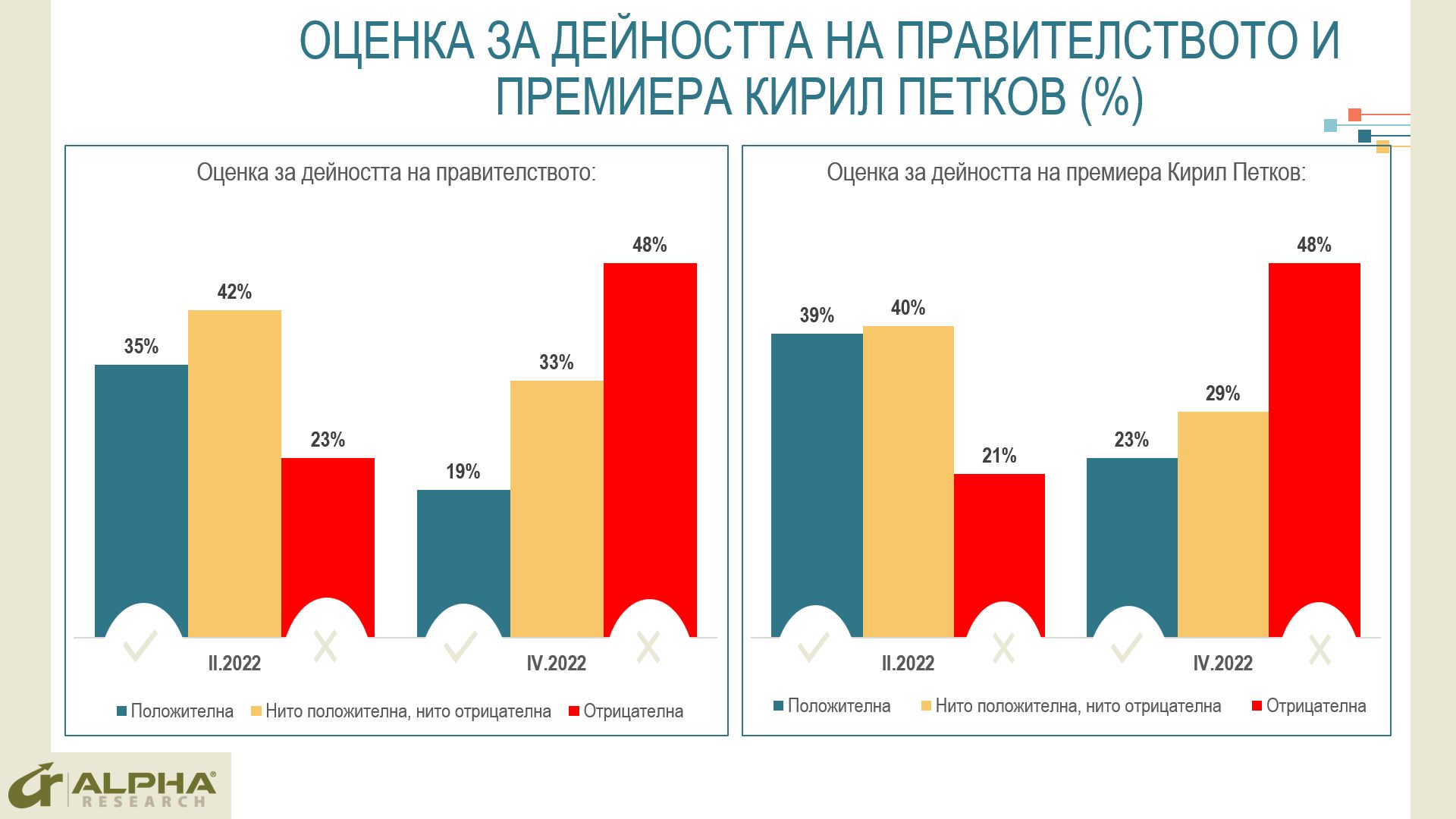 Проучването записва спад в утвърждението (от 35% на 19%) и внезапен скок (от 23% до 48%) в неодобрението за активността на кабинета „ Петков “ за интервала февруари - април 2022г. Същата наклонност е налице и в рейтинга на премиера: позитивните оценки спадат от 39% на 23%, а негативните нарастват от 21% до 48%.