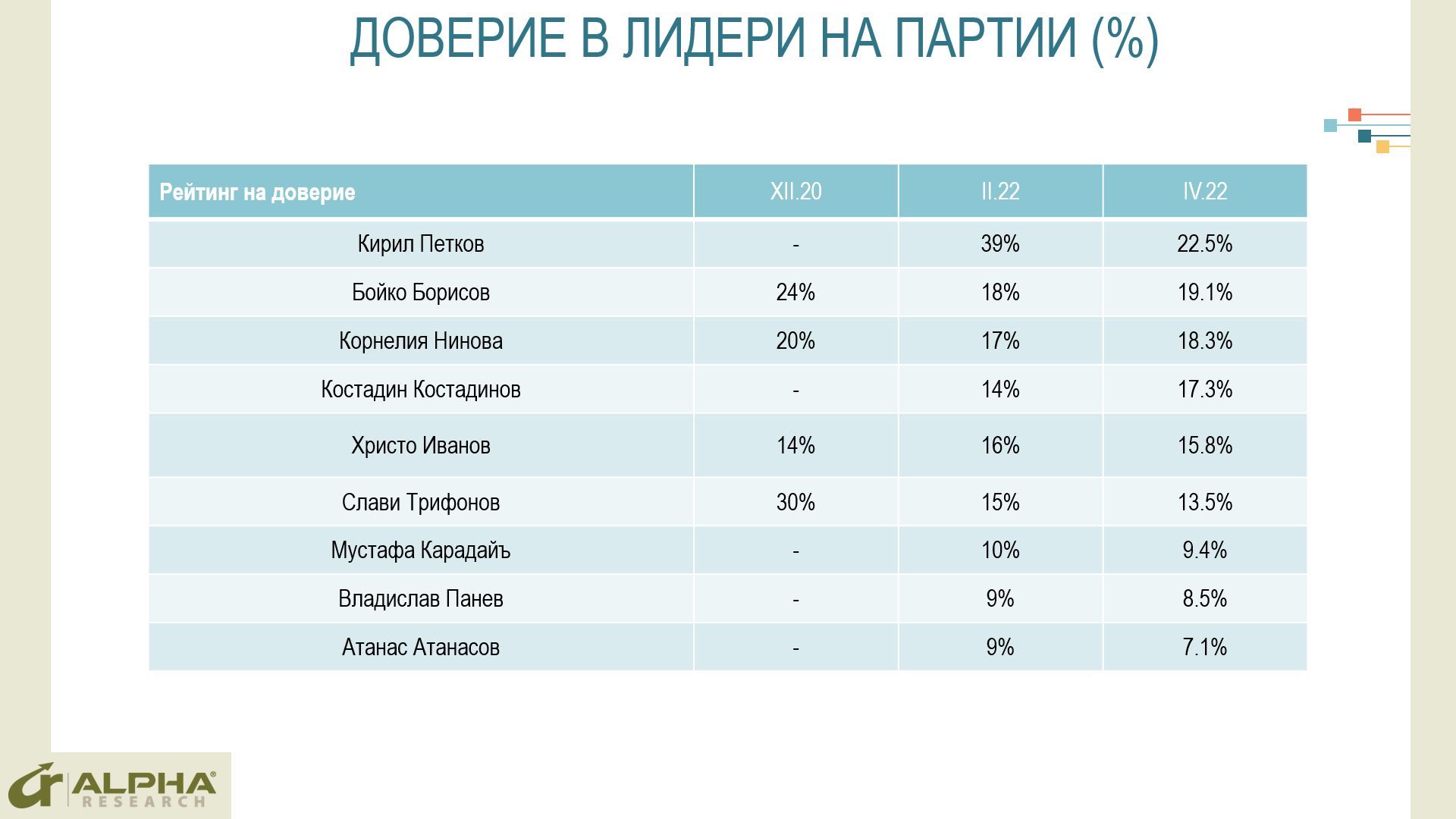 Втора позиция за Политическа партия с 18.4%, само че с отлив от 6.0 пункта за два месеца. По-значима е ерозията в персоналния рейтинг на К. Петков (от 39% до 22.5%). Въпреки тази отрицателна наклонност той остава най-одобряван измежду партийните водачи.