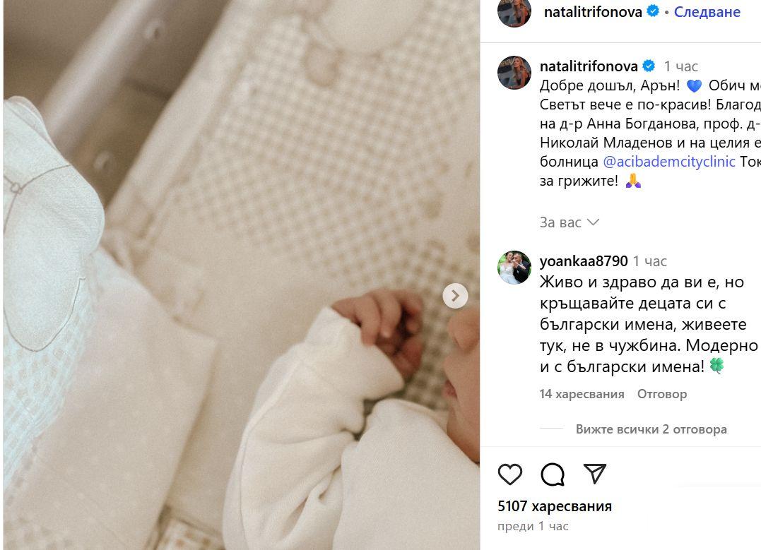 Натали Трифонова сияе от благополучие – стана майка за първи път и гордо сподели дребния Арън пред целия свят. Красавицата безусловно прелива от обич и деликатност в обществените мрежи, пуска трогателни фотоси и известия, а другари и сътрудници я засипаха с поздрави.