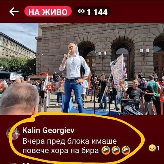Митингуващите из центъра на София викат " Долу сглобката! " ( " сглобката " е правителството), тъй като са срещу изпращането на военна помощ на нападнатата от Русия Украйна. Недоволстват и тъй като се чувствали излъгани от обединението " Продължаваме промяната - Демократична България ", която предизборно дала обещание да смени " модела ГЕРБ ", а влизайки във властта се съюзила с ГЕРБ и Движение за права и свободи, изясни Деян Николов ( " Възраждане " ). Загрижени са и за неприятните условия, при които работят парламентарните кореспонденти в някогашния Партиен дом. Те, на процедура, са изцяло изолирани от депутатите и биха могли да задават въпроси и беседват с народни представители, единствено в случай че самите те пожелаят и се явят пред медиите.