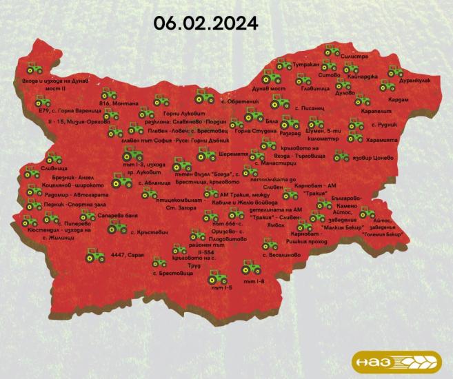 Точките, на които ще бъдат блокирани основни пътища в цялата страна от 10:00 до 12:00, можете да видите на картата.