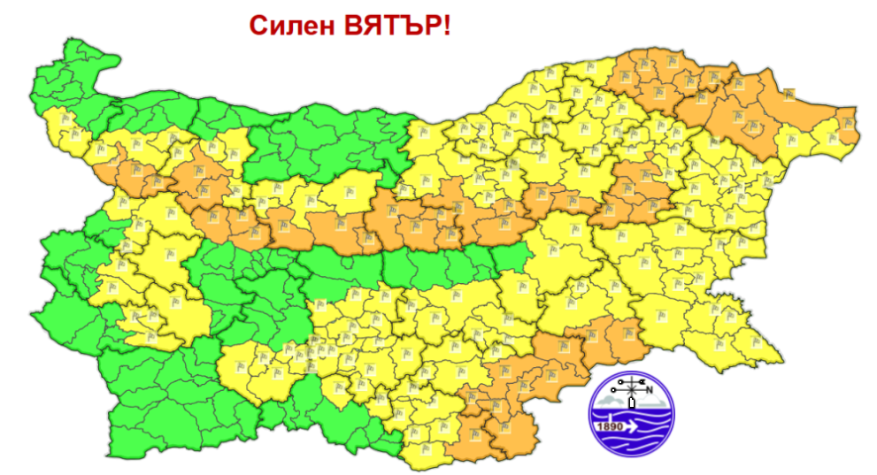 Националния институт по метеорология и хидрология (НИМХ) разгласи оранжев и жълт сигнален код за мощен вятър съвсем в цялата страна.