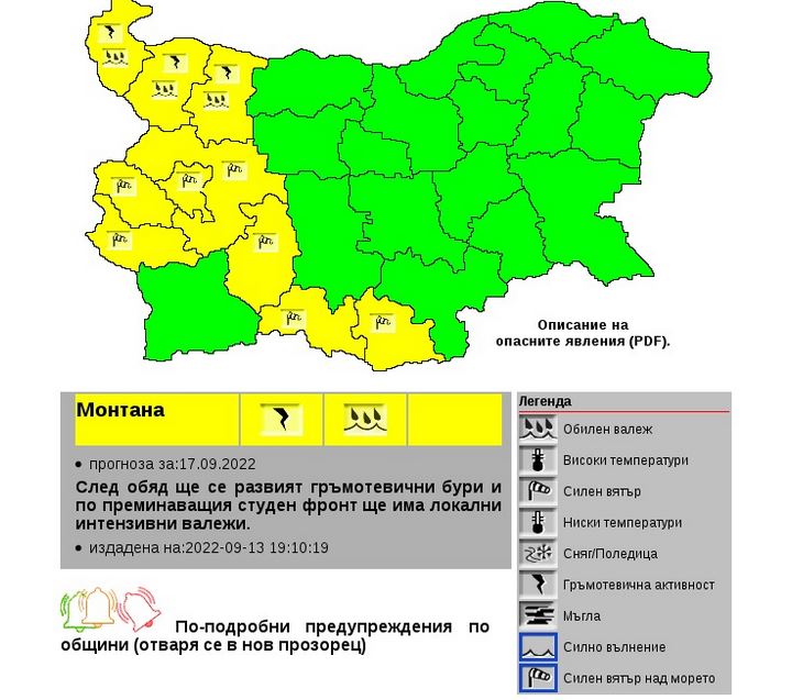 Националният институт по метеорология и хидрология (НИМХ) разгласи за на следващия ден, 17 септември, предизвестие от първа степен - жълт код, за интензивни превалявания и за мощен вятър.