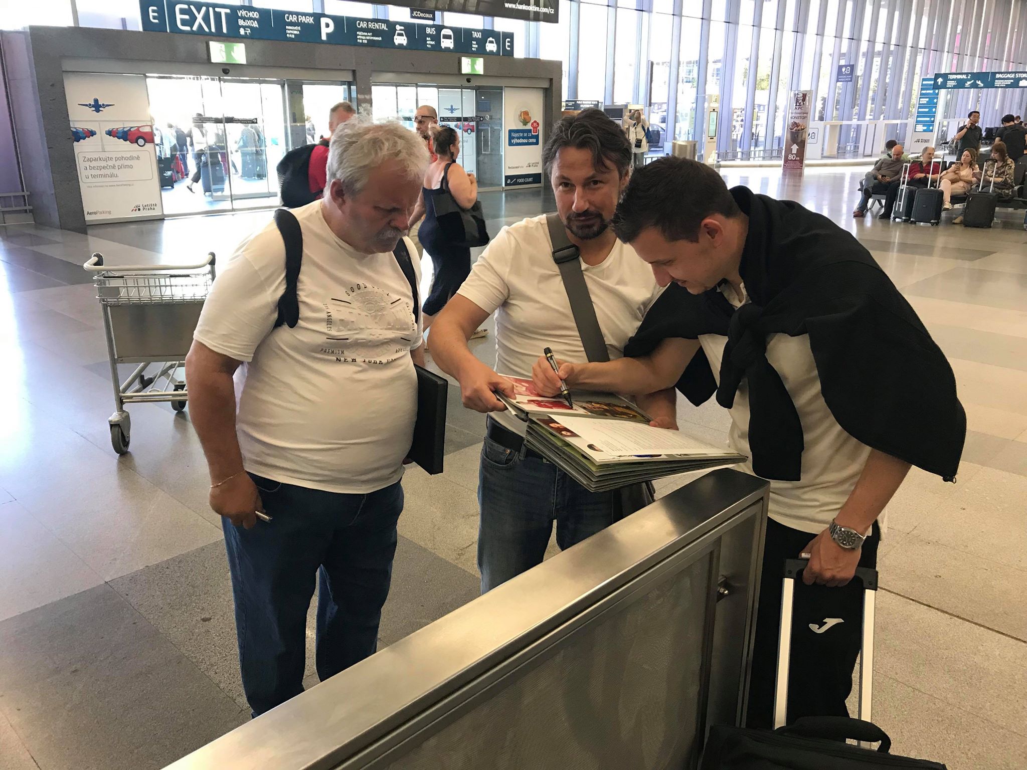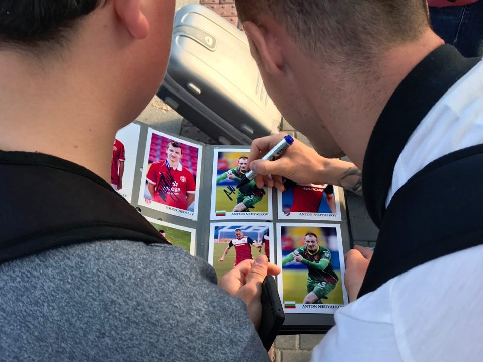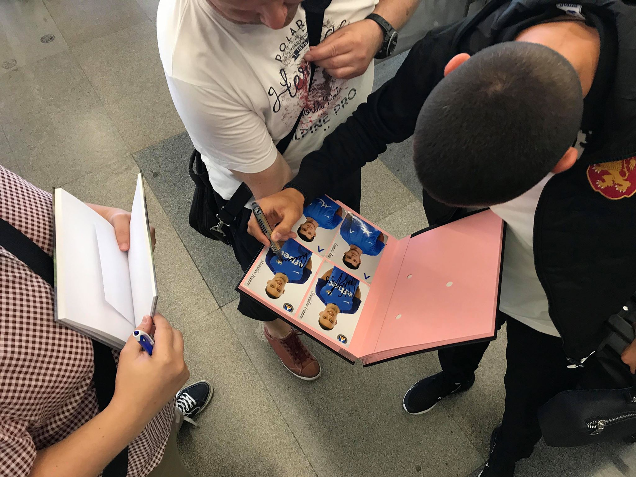 Автографи раздаде и селекционерът Красимир Балъков, който се готви за своя дебют отпред на трикольорите. " Лъвовете " от своя страна разписаха свои фотоси и зарадваха българите на летището.