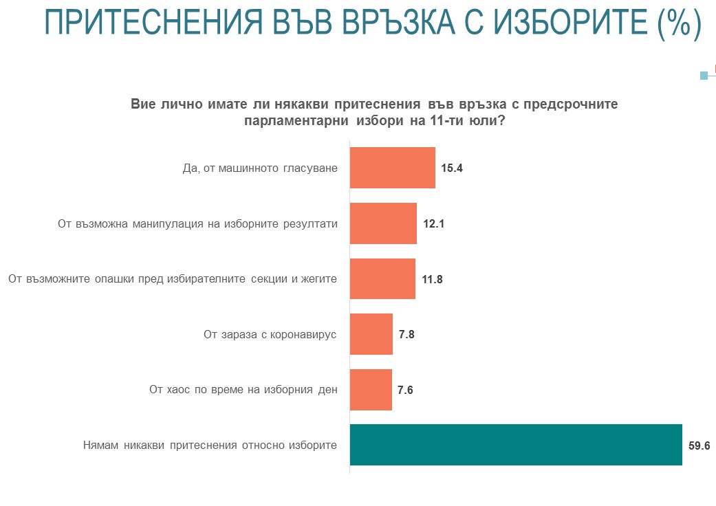 Между 47 и 50 на 100 от интервюираните пълнолетни жители декларират твърда подготвеност да гласоподават на изборите в неделя. Това значи до урните да отидат сред 3.1 млн. и 3.3 млн. души. Мобилизиращ фактор е желанието на всяка от двете съществени групи гласоподаватели – от една страна, симпатизантите на ГЕРБ, от друга, на протестните партии – с вота си да дефинират посоката на развиване на страната и да излъчат държавно управление към техните политически сили. В противоположна посока работят терзанията от машинното гласоподаване, които могат да се трансфорат в евентуална преграда пред част от гласоподавателите. 15.4% от всички интервюирани декларират, че имат терзания от машинното гласоподаване, а 11.8% от вероятни опашки пред изборните секции в следствие от по-бавното гласоподаване. Най-сериозно отражение би имал новият метод на гласоподаване върху гласоподавателите на Българска социалистическа партия, от които всеки четвърти и на Движение за права и свободи, от които всеки трети показва безпокойствие от този избор. 12 на сто имат подозрения за операция на изборните резултати. Значително са намалели терзанията от болест с ковид – 7.8%. Както и на предходните избори, вероятни са по-големи амплитуди на изборната интензивност, не на последно място, и поради разширените благоприятни условия на вота от чужбина.