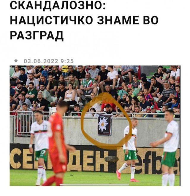 обективът на македонските фоторепортери явно не и българските) „ улови “ знаме на трибуните, което има нацистки нюанс.