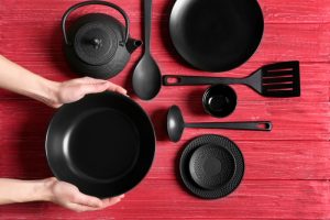 Черния цвят ние подсъзнателно свързваме с гнилост и разлагане. Когато храната не просто се скапва (това е сивият цвят), а протича физически развой на разложение, в природата нейния цвят се сменя с черен. А такава тъмна субстанция мозъкът възприема като неядивна, а също по този начин и като евентуално рискова. За вечерни празненства черните съдове стоят добре, храната в тях наподобява привлекателно. Но черните чинии не подтикват апетита, в случай че се употребяват всеки ден.