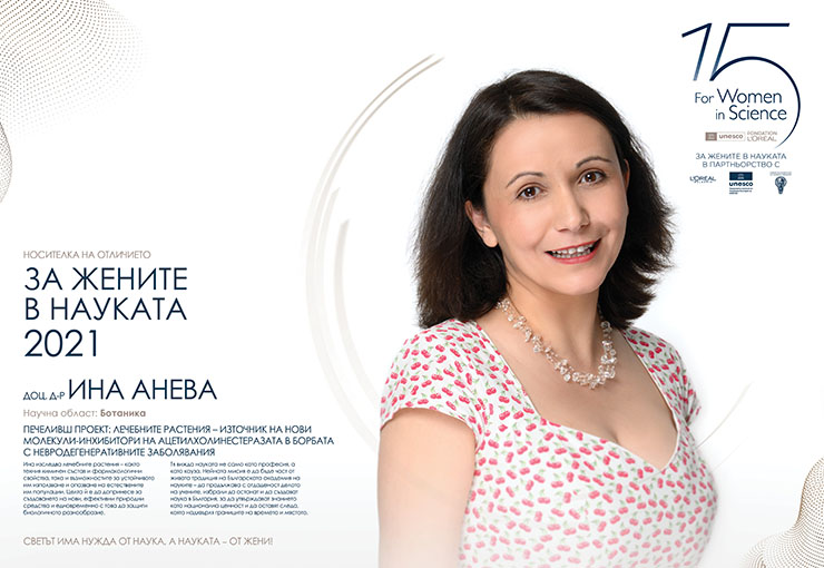 Ина Анева е носителка на оценката „ За дамите в науката “ през 2021. Нейната професионална сфера е ботаниката – изследва химичния състав и фармакологичните свойства на лечебни растения, както и опциите за устойчивото им потребление и запазване. Работата ѝ цели да съчетае обичайното познание с нови научни подходи, с цел да сътвори ефикасни естествени средства и да отбрани биоразнообразието. Какво ви притегли към проучването на растения? Още от дете усещах дълбока връзка с природата – първата ми обич бяха животните, а след това погледнах и към растенията; всичко живо към нас ме вълнуваше и изпълваше с учудване. Винаги съм желала работата ми да има смисъл и да носи изгоди за хората. Първоначално се насочих към молекулярната биология, само че опитите с животни ме накараха да потърся път, който да съчетава научния интерес с етичните ми убеждения. Така открих ботаниката – свят, в който всяко растение заема своето място и носи своя неповторим химичен „ почерк “. Българската флора е извънредно богата – на относително дребната ѝ територия са открити към 4100 типа висши растения, доста от които едва проучени. Именно това чувство за откриване на тайните в този мистериозен свят на растенията, ме увлече и задържа в науката.