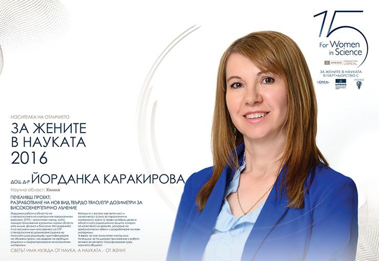 Йорданка Каракирова е носителка на оценката „ За дамите в науката “ през 2016. Нейната професионална област е химията – изследва по какъв начин радиацията въздейства на разнообразни материали и ползва електронно-парамагнитна резонансна (ЕПР) дозиметрия за оценка на радиационни дози. Работата ѝ е значима за медицината, нуклеарната енергетика и радиационната сигурност. Какво е преимуществото на новите дозиметри, които разработвате, спрямо признатите дозиметрични материали – и за какво това е значимо за области като медицината и нуклеарната сигурност? През последните години все по-широко приложение намира така наречен дозиметрия с твърдо тяло, употребяваща способ на електронен парамагнитен резонанс (ЕПР). Това е одобрен способ, утвърден от Международната организация по стандартизация, който се базира на вещество, наречено L-аланин. Макар и благонадежден и сензитивен, аланинът има и своите дефекти, по тази причина учените не престават да търсят нови, по-ефективни материали. Точно върху това беше фокусиран и моят план по програмата „ За дамите в науката “ – основаване на нов вид дозиметър, изработен от захароза (обикновена захар). Захарта има няколко забавни преимущества. Освен че е елементарно налична и евтина, тя може да се употребява както при облъчване с гама лъчи, по този начин и с тежки заредени частици – последните се употребяват да вземем за пример в модерната лъчетерапия за лекуване на рак. Още нещо любопитно: при облъчване захарозата трансформира цвета си – от бяла става кафява, и това оцветяване остава даже откакто се разтвори във вода. Така тя може да се употребява за премерване на погълнатата доза радиация освен с неповторима инсталация като ЕПР спектрометър, само че и с по-достъпни способи, като спектрофотометър. Освен това, захарозата е тъкано еквивалентна, което я прави подобаваща както за ретроспективна, по този начин и за спешна дозиметрия.