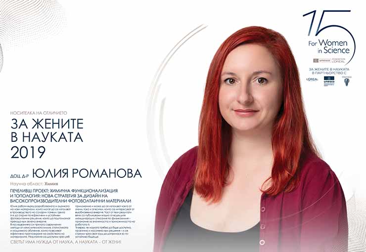 Доц. доктор Юлия Романова е носителка на оценката „ За дамите в науката “ през 2019. Тя работи в региона на фотоволтаичните технологии и търси нови решения за дейно хващане на слънчевата сила за по-чиста и налична електрическа енергия. Какви са най-обещаващите нови технологии, които съгласно Вас имат капацитета да революционизират фотоволтаичната промишленост в идващите 5–10 години? В идващите 5–10 години се чака да бъдат създадени нови технологии, които да усилят успеваемостта на фотоволтаичните кафези, да понижат цената им, както и да улеснят тяхното произвеждане, апаратура и ползване в огромни мащаби. За задачата се работи в няколко посоки. Първото направление е създаването на ново потомство доста по-успешни фотоволтаични материали. Второто направление е конструирането и оптимизацията на по този начин наречените тандемни слънчеви кафези, при които се комбинират преимуществата на няколко фотоволтаични материала по едно и също време. Третото направление цели разработка на пластични и леки слънчеви кафези, които са идеални за приложения при портативни електронни устройства и покриви на транспортни средства, където обичайните слънчеви кафези са непрактични. И последното направление е основаването на интелигентни фотоволтаични съоръжения, като да вземем за пример жилищни здания, които са с вградени транспарантни фотоволтаични кафези в прозорците.