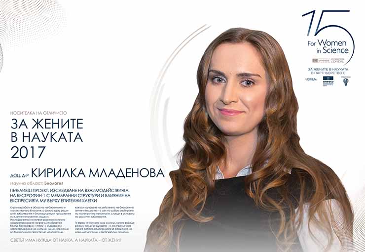 Кирилка Младенова е носителка на оценката „ За дамите в науката “ през 2017. Нейното професионално занятие е биологията – изследва механизмите на очните болести и търси нови лечебни подходи посредством използване на биомедицински и молекулярни технологии. Целта ѝ е да усъвършенства лекуването и качеството на живот на пациенти с очни увреждания. Как се насочихте точно съответно към тези пътища на лекуване и по какъв начин смятате, че могат да създадат медицината по-ефективна? Живеем в извънредно забавни времена. За редица болести, които преди десетилетие са били изцяло или съвсем изцяло непознати, е насъбрана задоволително информация с цел да може сполучливо да се тестват и внедрят новаторски способи за ранна диагностика и лекуване. В това отношение не вършат изключение и макулопатиите.Към момента на започване на работа за път на повлияване прогресията и изхода на бестрофинопатиите не се говореше както в България, по този начин и в чужбина, заради липса на задоволително проучвания за молекулните механизми за развиването на патологията. Към тематиката ме насочи моят наставник и началник проф. Йордан Думанов. В разследване на данните, получени от нашия екип, както и екипи от Европа и Съединени американски щати, към този момент решително може да приказваме за доста равнище на схващане на всички аспекти болестта.