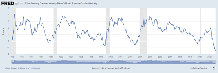 Най-дълбоко обърнатата част от кривата на рентабилност в Съединени американски щати е тази, която не е изпратила подправен сигнал за вероятностите за криза в Съединени американски щати за повече от половин век проучвания.Това е разликата сред доходността на 10-годишните и 3-месечните съкровищни облигации, която беше към 155,8 базисни пункта под нулата към сряда - отразявайки лихвен % по 3-месечните съкровищни бонове, който се търгува много над своя 10-годишен аналог.Голямата разлика сред двата % сочи към вероятността от „ дълбока криза “, съгласно Кембъл Харви, професор от университета Дюк, който е пионер в потреблението на спреда като знак за предстоящ стопански напредък.Страховете от криза още веднъж са на фокус, откакто данните от тази седмица предоставиха нови доказателства, че годишният цикъл на повишение на лихвите на Федералния запас най-сетне оказва въздействие върху пазара на труда. Въпреки че волатилността на пазара на облигации се намали през последните три седмици, проблемите с ликвидността и опасенията по отношение на евентуална рецесия на тавана на дълга на Съединени американски щати не престават да изтезават държавните облигации и да изострят придвижванията на пазара, съгласно Том ди Галома, ръководещ шеф и съ-ръководител на лихвите търговия за компания за финансови услуги BTIG. Спредът 10 години/3 месеца е още под нулата, в сравнение с беше в навечерието на финансовата рецесия от 2007-2008 година и в края на 80-те години, когато Федералният запас върна лихвените проценти над 8% до 9%.
