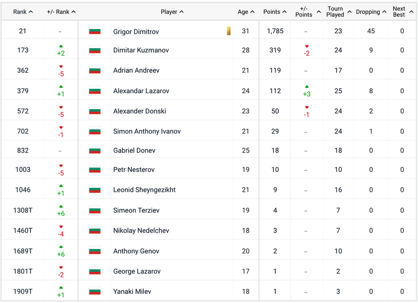 От другите българи Димитър Кузманов записа ново рекордно класиране в кариерата си - 173-то място с актив от 319 точки. Адриан Андреев падна с пет места до №362 със 119 точки, а Александър Лазаров се изкачи с една позиция доо №379.
