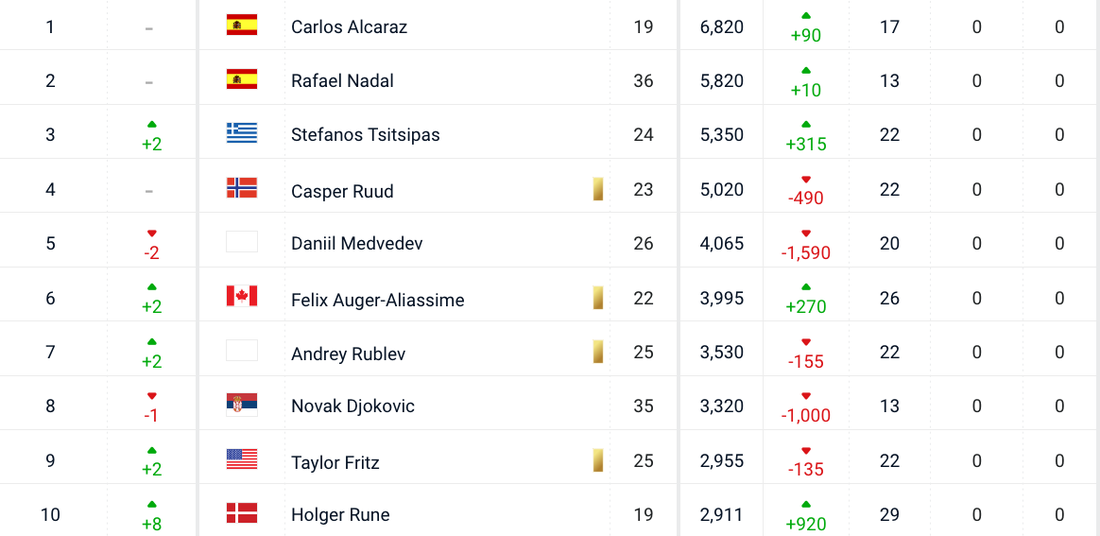 Карлос Алкарас остава на върха с 6820 точки, следван от сънародника си Рафаел Надал с 5820. На трето място се изкачва гръцкият тенисист Стефанос Циципас с 5350 точки.