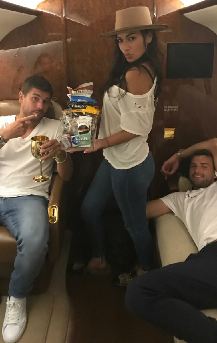 Красивата американка театралничи на фотография, на която предлага лакомства в самолета на Гришо и треньора му Даниел Валверду.