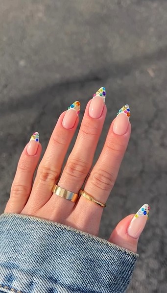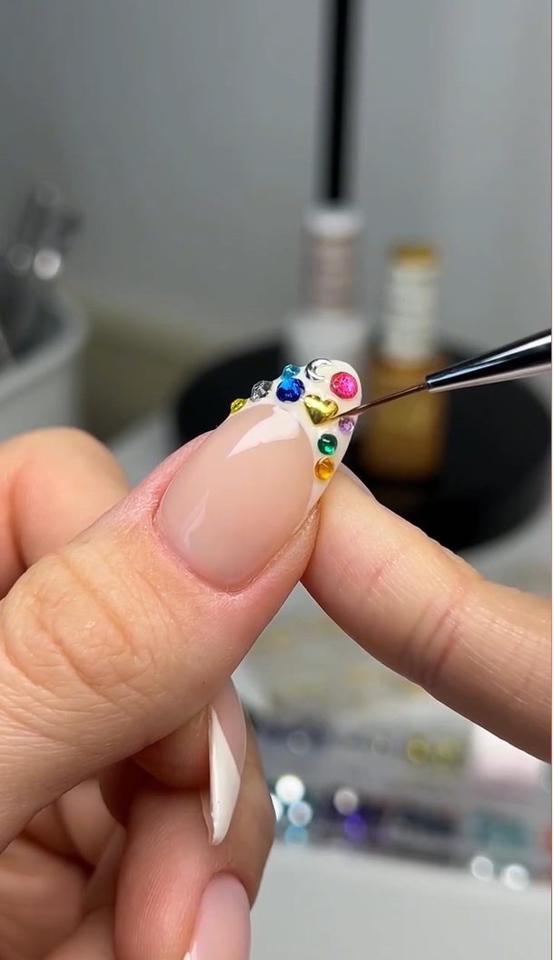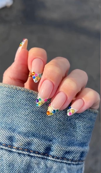 А другата добра вест е, че елементарно ще го извършите даже сами у дома. Започнете като нанесете основа, а по-късно полупрозрачен нюд лак за нокти. После покрийте върховете с класическия бял лак. След това използвайте камъчета за нокти в разнообразни цветове и размери и ги поставете в бялата част на маникюра.