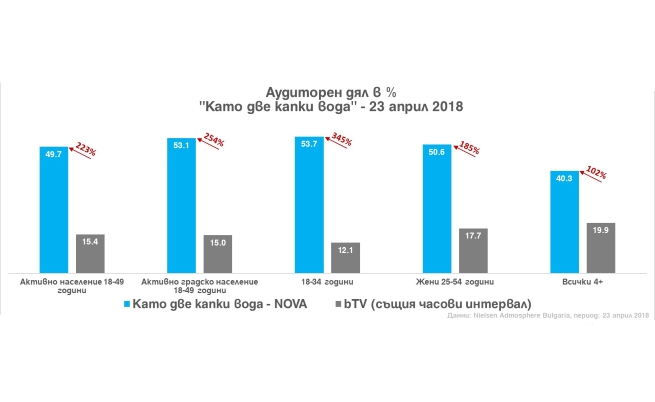 Най-гледаният сезон на паметното шоу "Като две капки вода " продължава своя успех в телевизионния ефир - вчерашният епизод на шоуто е с максимален междинен аудиторен дял от 2014 година насам, а в най-напрегнатите моменти 1 344 100 души са гледали NOVA. Повече от 40% от феновете пред екраните избраха следващия впечатляващ епизод на най-гледаното шоу в ефира на NOVA, което е над два пъти повече от каузи на втората по гледаемост телевизия по същото време, бТВ. Половината от дейното население в България (18-49 г.) пред екраните избра „ Като две капки вода “ с аудиторен дял над 3 пъти по-голям от каузи на бТВ по същото време. Най-голямо желание към занимателните превъплъщения демонстрираха феновете на възраст 18-34 години - 53,7% аудиторен дял, което е с над 40 пункта повече от каузи на бТВ по същото време, измежду същата аудиторна група.