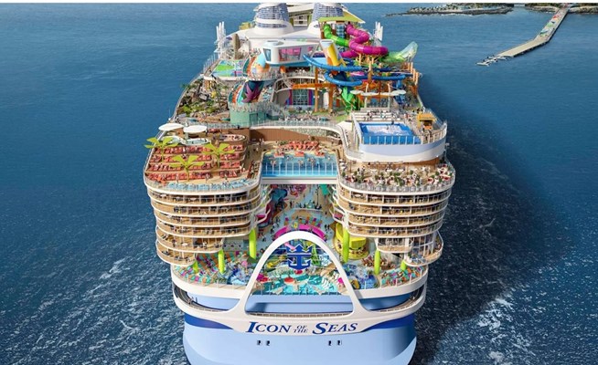 Icon of the sea e на процедура един от първите круизни кораби от този тип, които се строят след пандемията. Круизният туризъм пострада най-тежко от ковид, като съвсем година и половина по света не плаваше нито един подобен транспортен съд. Много от круизните компании се опитваха да продадат корабите си, само че нямаше търсене.