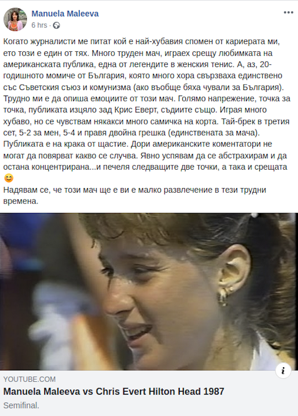 " Когато публицисти ме питат кой е най-хубавият спомен от кариерата ми, ето този е един от тях. Много сложен мач, играех против любимката на американската аудитория, една от легендите в женския тенис. А аз, 20-годишното момиче от България, която доста хора свързваха само със Съветския съюз и комунизма (ако изобщо бяха чували за България). Трудно ми е да опиша страстите от този мач. Голямо напрежение, точка за точка, публиката напълно зад Крис Еверт, съдиите също. Играя доста хубаво, само че се усещам някакси доста самичка на корта. Тай-брек в третия сет, 5-2 за мен, 5-4 и върша двойна неточност (единствената за мача). Публиката е на крайници от благополучие. Дори американските коментатори не могат да повярват какво се случва. Явно съумявам да се абстрахирам и да остана съсредоточена...и спечелвам идващите две точки, а по този начин и срещата. Надявам се, че този мач ще е ви е малко забавление в тези сложни времена ", написа във Фейсбук Малеева.