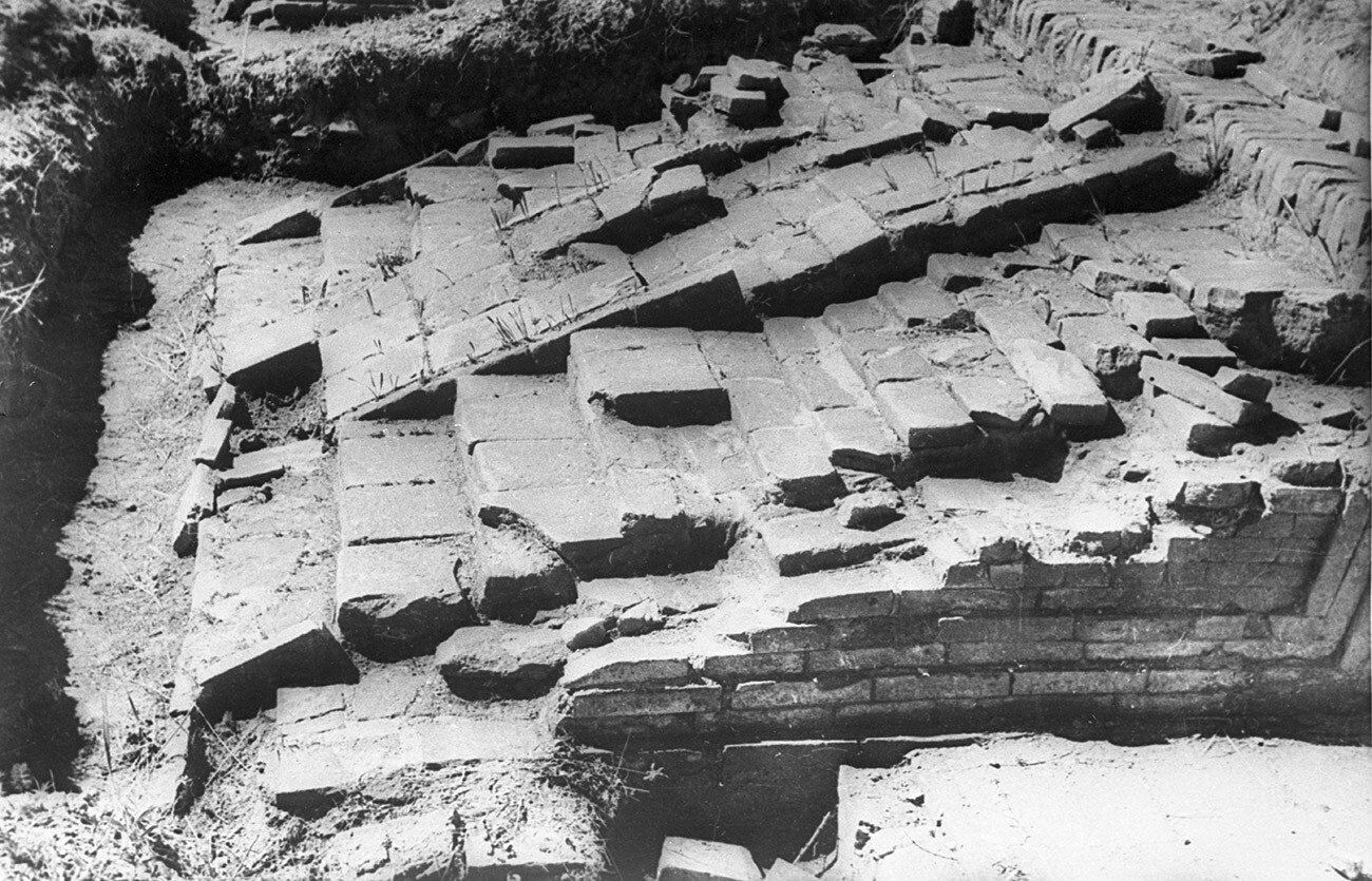 „ Участвах в разкопките през 1957 и 1963 година. Да се стигне до такава степен можеше единствено с дребен аероплан или на кон. <…> Бяхме трима археолози и 15 служащи – живеехме на острова измежду езерото в палатки, работехме, ловяхме риба, гонехме мухите “, си Вайнщайн. На острова зад крепостните стени те намират 27 жилища с дворове, а до момента в който разкопават един от хълмовете, намират руините на замък. Покривът му е затрупан с глинени керемиди и се държи на 36 дървени колони. Там намират и орнаментални стенописи с геометрични форми, изпълнени с извънредно ярки, топли цветове в червени, оранжеви и жълти тонове. На места има и непокътнати следи от дюшеме.
