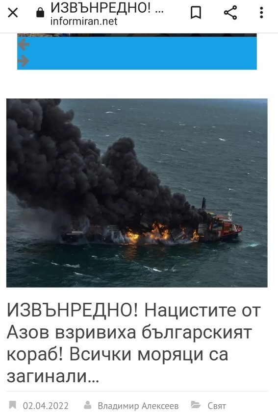 Твърдението, че български транспортен съд е взривен от нацистите от „ Азов " и всички моряци са починали, е НЕВЯРНО . Това не се удостоверява от нито една българска институция. Корабът „ Царевна “, който от началото на войната в Украйна е блокиран на пристанището в Мариупол продължава да е там дружно с екипажа си.