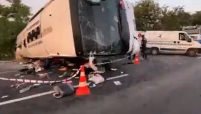 Катастрофата е станала рано сутринта в окръг Денизли. Шофьорът на камиона, претрупан с пясък, изгубил ръководство, навлязъл в насрещното платно и се блъснал в рейса, който се преобърнал от удара.
