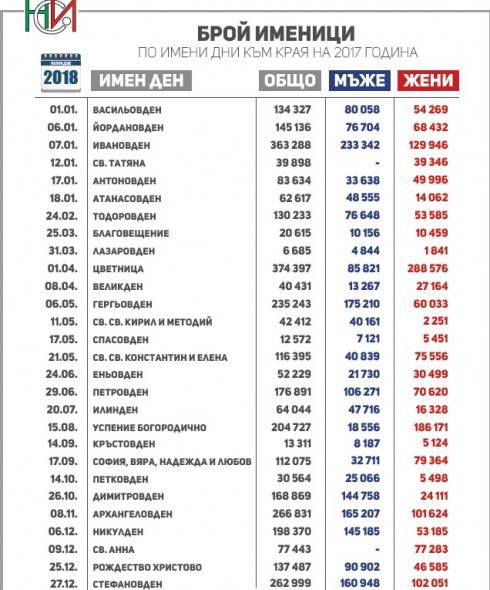 В първия месец от годината имен ден имат и Теодосий (11.01), Татяна (12.01), Евтим (20.01), Максим (21.01) и Григорий (25.01). Най-голям е броят на празнуващите имен ден на Цветница -374 000 дами и мъже, съобщи Фокус.