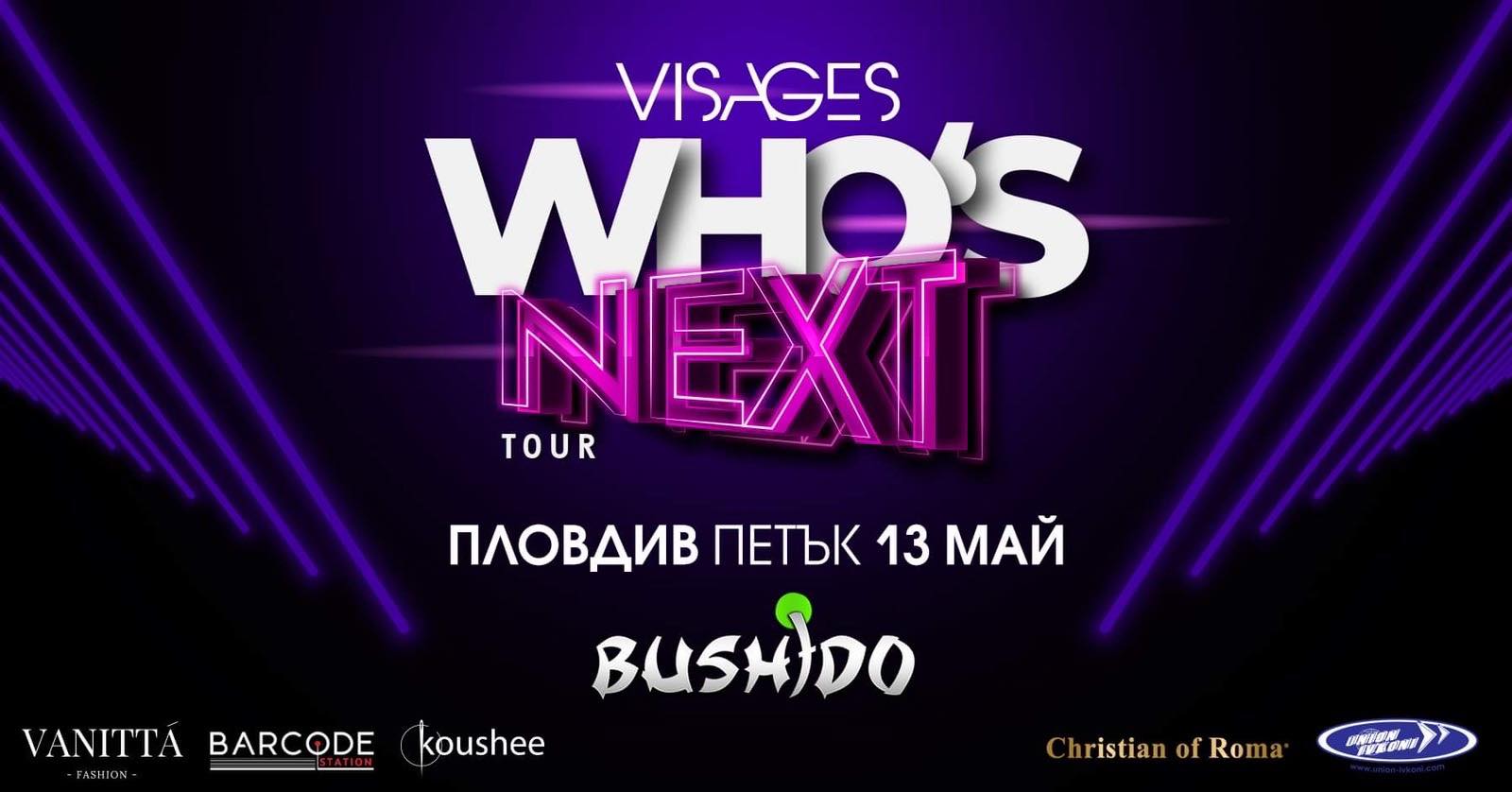 Най-модерният клуб под тепетата събира под един покрив най-красивите дами в България този петък . На 13 май в 12:30 ч. в Bushido Club ще започва турнето на фешън организация „ VISAGES” , което носи името „ Who is next…”. В него присъединяване ще вземат едни от най-неотразимите български модели , които ще оставят без мирис мъжката част от аудиторията.