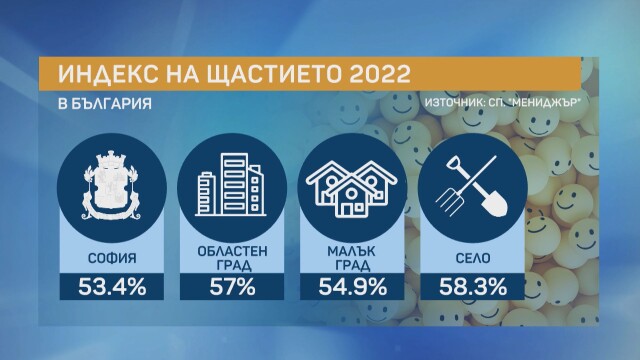 Резултатите демонстрират също, че хората в селата са по-щастливи от тези в града. За София 53,4% от хората са щастливи, до момента в който на село – 58,3%.