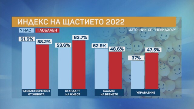 Като изцяло нещастни са избрани 29% от популацията, като тук има 4% растеж. Едва 4% са изцяло щастливите, а 20% са щастливи. „ Виждат се първите неприятни признаци в подтекста на пандемията, инфлацията и войната “, сподели основният редактор на списанието Весислава Антонова.