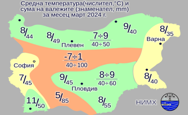 Н ай-ниските температури през март у нас ще бъдат сред минус 5 и 0 градуса, а най-високите - сред 20 и 25 градуса. Това заяви за Българска телеграфна агенция Анастасия Кирилова, синоптик в Националния институт по метеорология и хидрология (НИМХ), представяйки прогнозата за времето през март в България.