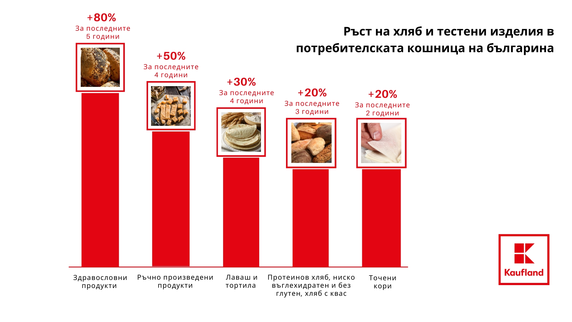 Според данните отчетливо нараства търсенето на по-здравословни тестени артикули, като за последните пет години нарастването е с 80%. Най-силно изразена е тази наклонност при хляба, където потребителите демонстрират възходящо желание към по-здравословните и богати на фибри други възможности като пълнозърнести и многозърнести артикули, както и самун без глутен. Все по-нарастващият интерес на българите към питателните изгоди от съставки като ръж, елда, просо и ленено семе, оказват 20% растеж в продажбите на протеиновия самун, нисковъглехидратния и безглутенов самун, както и този създаден с жива мая.