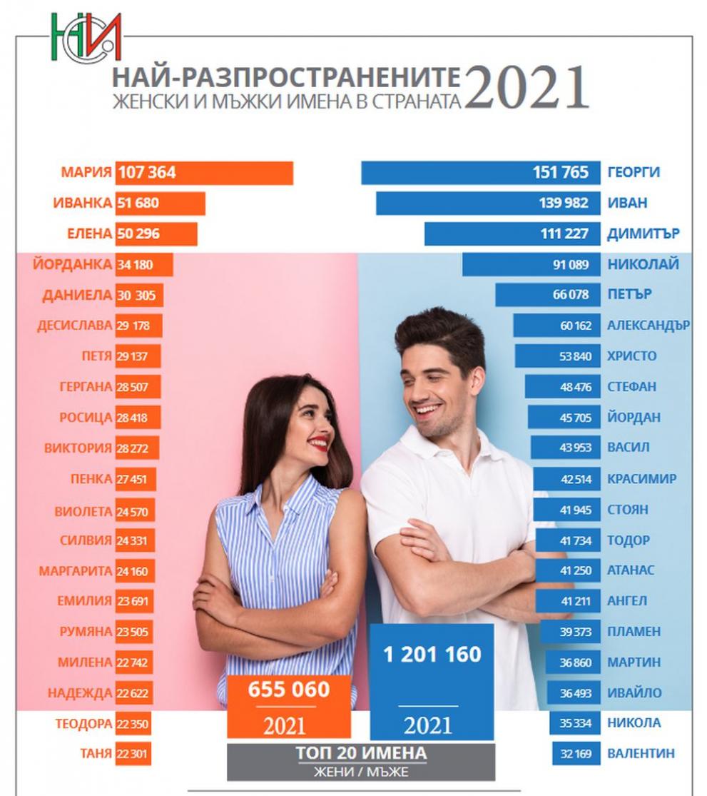 Най-разпространениете женски и мъжки имена в страната през 2021 година са Мария и Георги, оповестиха от Националния статистически институт.