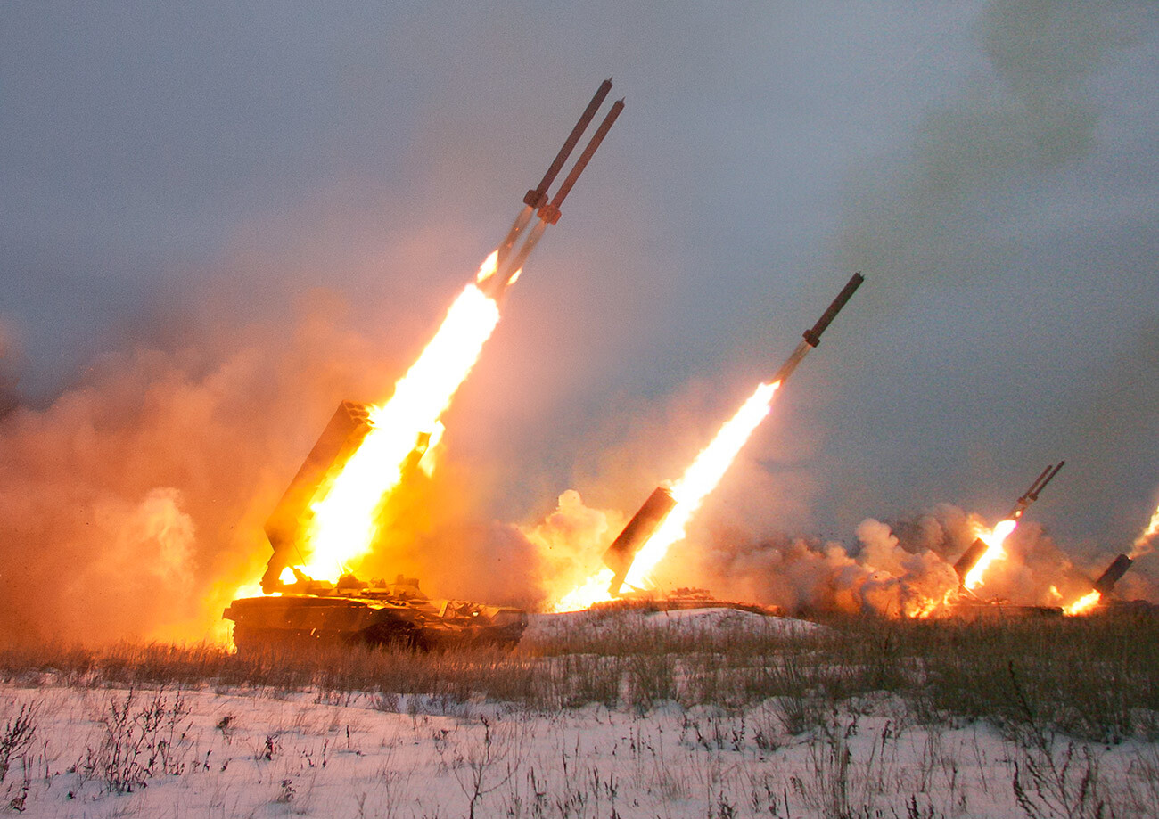 Вадим Савицки/Global Look Press От разстояние следите от обстрела на ТОС-1А „Солнцепек“ наподобяват типични за артилерията – елементарни експлоадирания в огън и кълбета пушек.