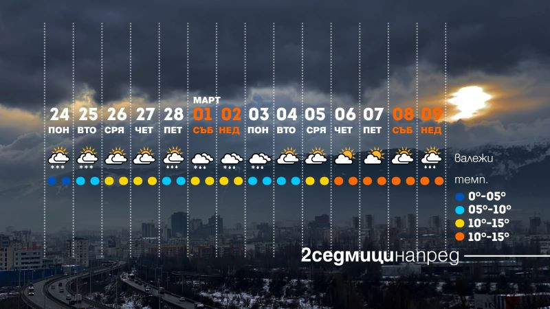 В петък е допустимо да превали дъжд за малко, локално и едва в Западна България. През почивните дни и на националния празник 3 март страната ни ще попадне в дейната зона на циклон. Ще има превалявания от дъжд, които с понижението на температурите ще се обръщат в сняг. По- съществено струпване ще има в планините с условия за комплициран трафик по проходите. Температурите по време на преваляванията няма да падат фрапантно. В събота и неделя дневните стойности ще са сред 9 и 14 градуса, на 3 март – от 4 до 9 градуса.