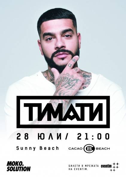 КОНЦЕРТЪТ НА ТИМАТИ В СЛЪНЧЕВ БРЯГ е на 28 юли 2018 година на CACAO BEACH. Начало 21:00 часа. Билети към този момент са в продажба и могат да бъдат закупени в мрежата на Eventim в цялата страна. Цена на билетите: 50 лв., а на място в деня на концерта: 70 лева