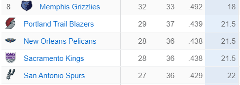 В момента последното плейофно място в Западната конференция принадлежи на Мемфис Гризлис, който е с баланс 32-33. Портланд е девети с 29-37, Ню Орлиънс Пеликанс и Сакраменто Кингс са с 28-36, а Сан Антонио е с 27-36.