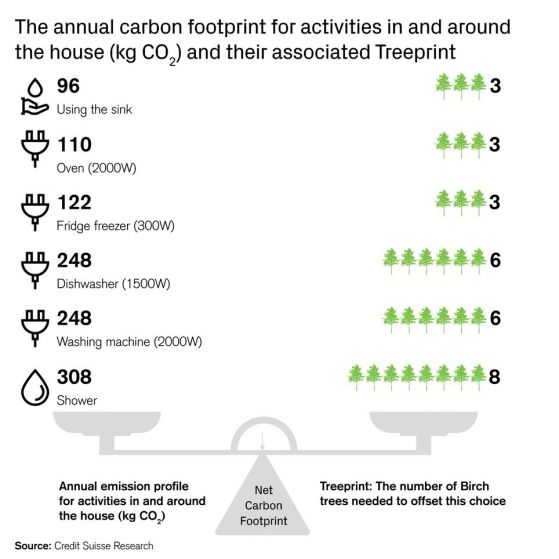 В отчета са изброени разнообразни рутинни действия от всекидневието ни и отпечатъците, които те оставят, измерени в брой зрели дървета. Но не с цел да бъде наложена възбрана на избрани храни, питиета, пътуванията и естествените ни привички, а с цел да придобием действителна визия какъв е нашият карбонов отпечатък като консуматори и по какъв начин той може да се компенсира. Защото точно вследствие на потребителските ни привички се създават 22% от въглеродните излъчвания. След като потребителите оценят дървесния отпечатък, нужен за компенсиране на въглеродния им отпечатък, те могат надлежно да понижат избрани действия или да засадят съответния брой дървета. Ежедневният душ, да вземем за пример, “струва ” 8 брези.