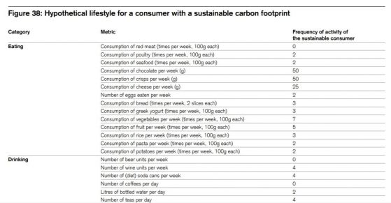 Единствените данни, които имат нещо общо с обявата в българския уебсайт, се откриват в таблица, озаглавена “Хипотетичен метод на живот на консуматор с резистентен въглероден отпечатък ” – т.е. какво бихте могли да (не) ядете, пиете или вършиме, в случай че желаете да допринесете за намаляването на въглеродните излъчвания.