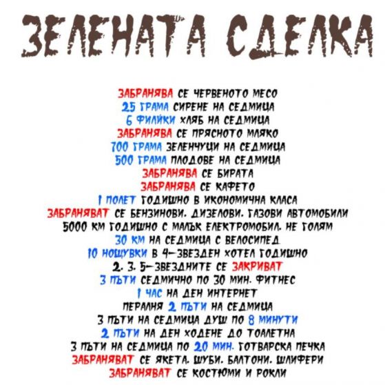 Не е правилно, че по силата на Зеления пакт на Европейски Съюз се не разрешават редица храни, артикули и услуги. Не е допустимо посредством отчет, направен от проучвателен институт към финансова институция в Швейцария, да се постановат забрани на държавите-членки на Европейски Съюз. Не дава отговор на истината изказванието, че Зелената договорка е самодейност на “част от най-богатите в света ”, които се пробват да я наложат на държавните управления.