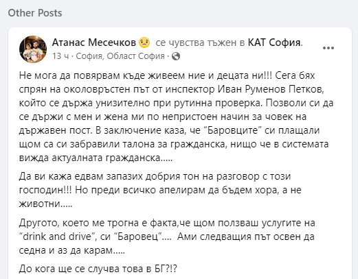 " Не мога да допускам къде живеем ние и децата ни! Сега бях спрян на околовръстен път от контрольор Иван Руменов Петков, който се държа унизително при рутинна инспекция. Позволи си да се държи с мен и жена ми по неприличен метод за човек на държавен пост. В умозаключение сподели, че “Баровците” си плащали щом са си не запомнили талона за гражданска, нищо че в системата вижда настоящата гражданска….. Да ви кажа колкото да резервирах положителния звук на диалог с този господин!!! Но на първо място моля да бъдем хора, а не животни….. Другото, което ме трогна е обстоятелството, че щом ползваш услугите на “drink and drive”, си “Баровец”…. Ами идващия път с изключение на да седна и аз да карам….. До по кое време ще се случва това в БГ?!? "