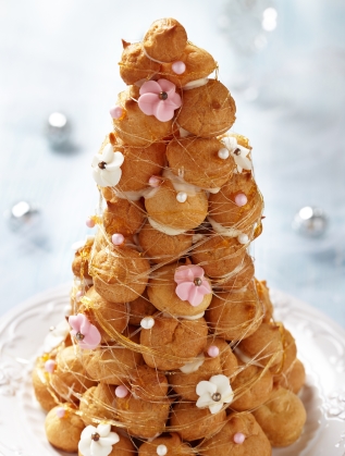 Долната част на профитеролите се потапя в карамела. Залепват се върху конус, направен от картон, облечен в алуминиево фолио и намазан с олио. От останалия карамел се подготвя тънка мрежа, с която се декорира готовата торта.