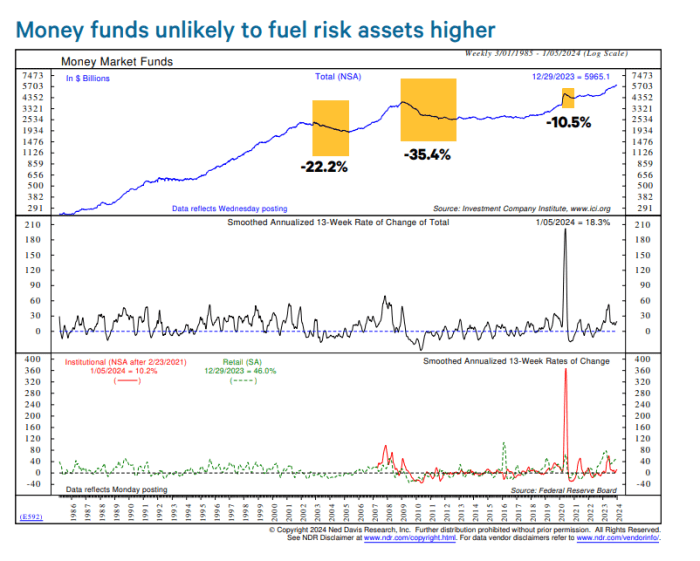Екипът на NDR откри три значими спада в данните за фондовете на паричния пазар през последните четири десетилетия, като най-големият спад от 35,4%, или 1,4 трилиона $, се случи преди дузина години в ерата след световната финансова рецесия.Други обилни интервали на спад на активите на паричния пазар бяха спадът от 22,2% след спукването на балона на софтуерните акции при започване на 2000-те години и спадът от 10,5% през 2020 година по време на пандемията.Трябва да се означи, че и трите минали интервала на спад съответстваха с дейностите на Федералния запас за облекчение на паричната политика, като в същото време поддържаха стопанската система, мотивирайки вложителите да трансферират средствата си от пари в брой в по-високодоходни активи, съгласно Калиш.Фондовете на паричния пазар са натрупали почти 1,4 трилиона $ през последната година, съгласно данните на NDR.Важно е, че тези минали спадове на активите на паричния пазар пристигнаха след огромни придвижвания на мечия пазар на акциите, които примамиха вложителите назад в акции.„ Днес не е налице нито едно от двете условия “, написа Калиш, изключително с фондовете на паричния пазар, които започват при 5% или повече, и акциите покрай рекордно високи равнища.Индексът S&P 500 SPX в четвъртък за малко се търгува в границите на деня над предходния си връх при затваряне, подложен преди почти две години. След огромни облаги през четвъртото тримесечие, Dow Jones Industrial Average DJIA също се повиши до серия от рекордни затваряния.Устойчивата стопанска система и внезапното оттегляне на 10-годишната рентабилност на държавните облигации през последните месеци на 2023 година предоставиха мощен катализатор за повишаване на акциите. Референтният лихвен %, който финансира огромна част от стопанската система на Съединени американски щати, за малко се търгува над 5% през октомври, само че от този момент се намали до към 4%, осигурявайки пролонгация за кредитополучателите, които би трябвало да наберат нов дълг или да рефинансират.*Материалът е с изчерпателен темперамент и не е съвет за покупка или продажба на активи на финансовите пазари.