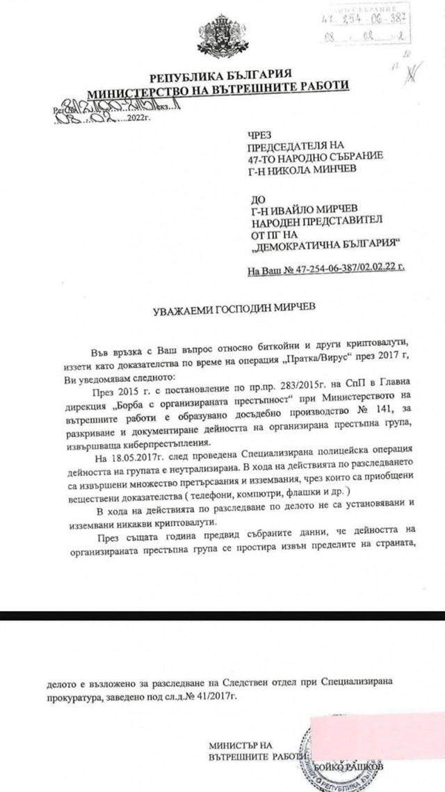 Припомняме, че депутатът от „ Демократична България “ Ивайло Мирчев изиска детайлна информация от вътрешния министър Бойко Рашков за биткойните, които по думите му са били конфискувани от Министерство на вътрешните работи като доказателства по време на интервенция „ ПРАТКА/ВИРУС “ през 2017 година и в този момент ги нямало.