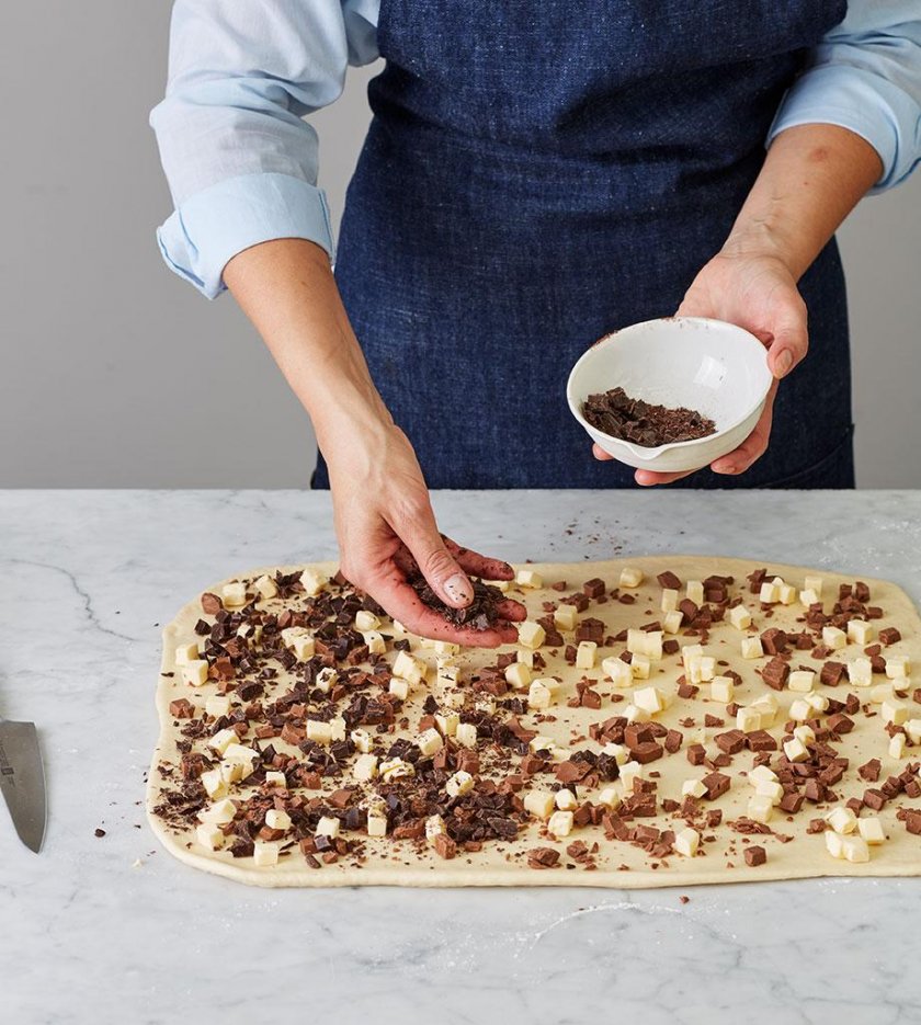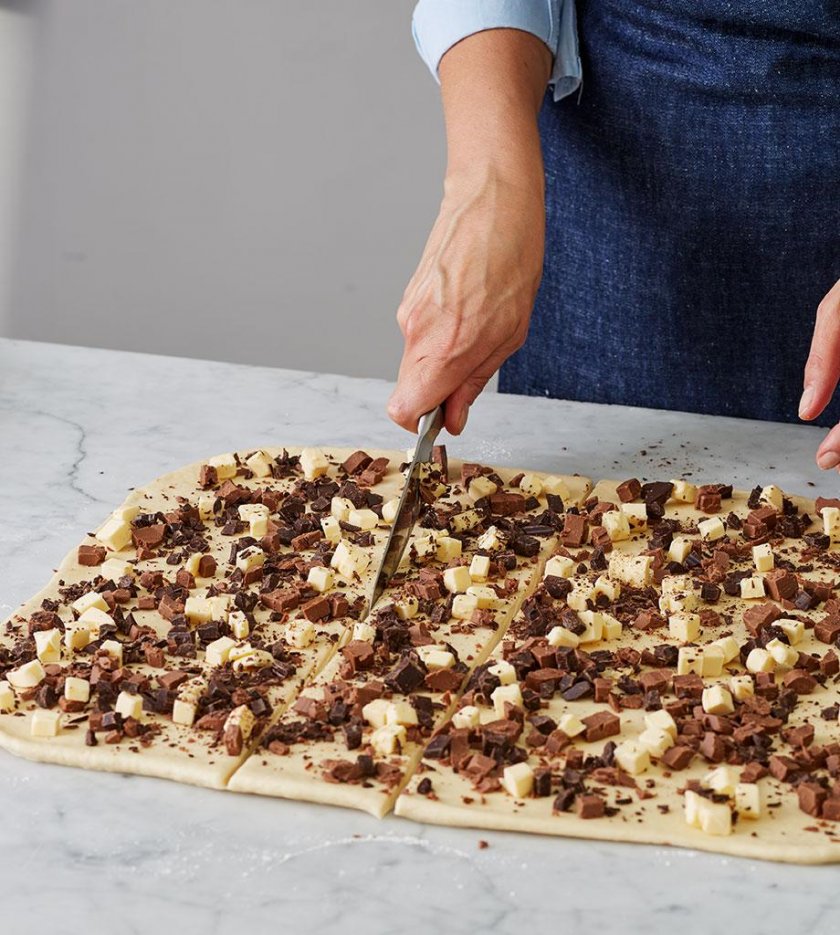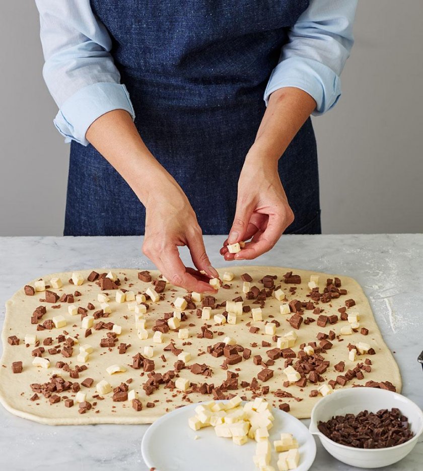Разстилат се върху кората втвърдените кубчета нуга крем и масло. Действа се бързо, с цел да не се разтопят от топлината на ръцете.